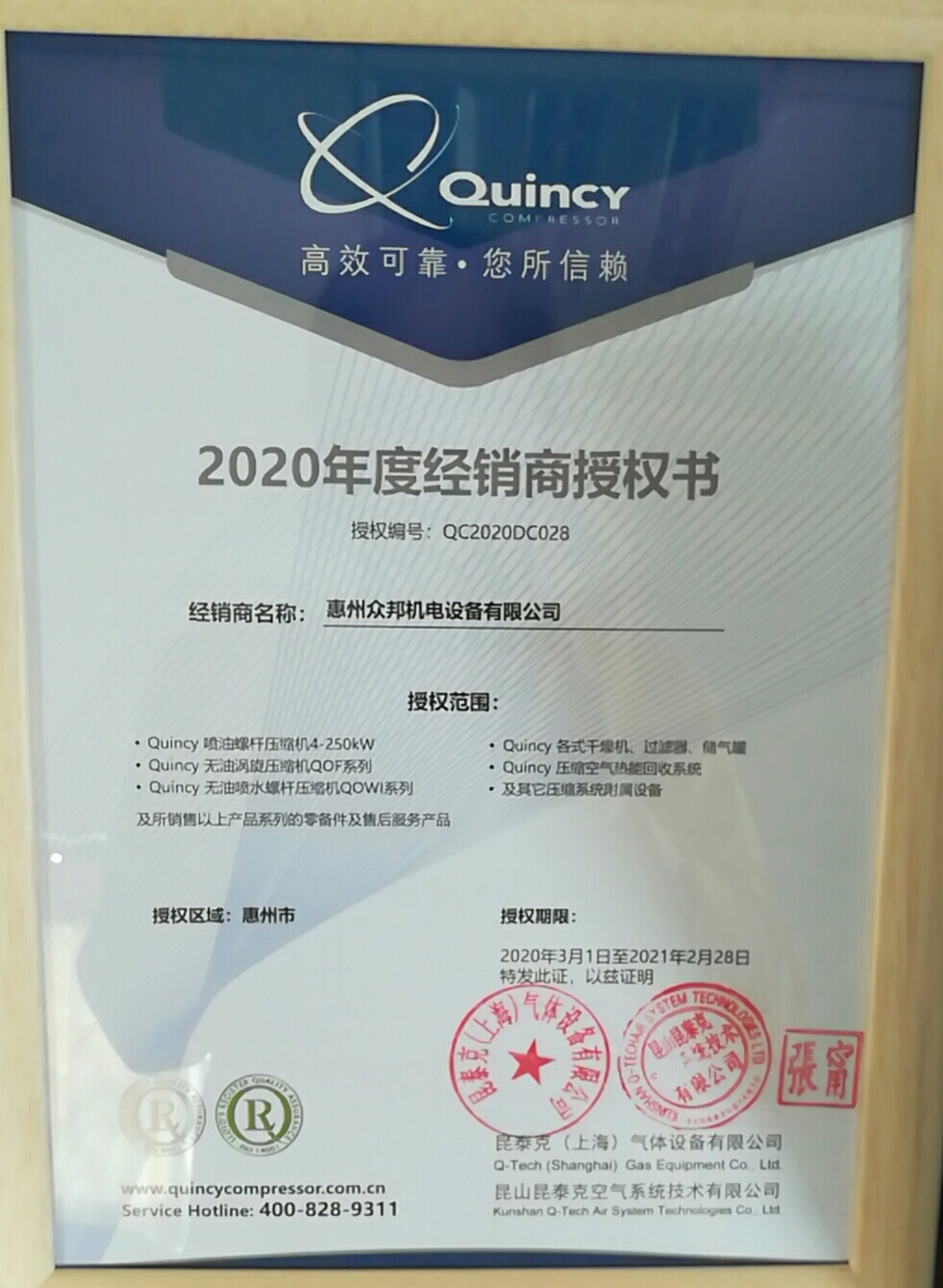 授權(quán)范圍:Quincy 昆西品牌,噴油螺桿壓縮機4-250KW