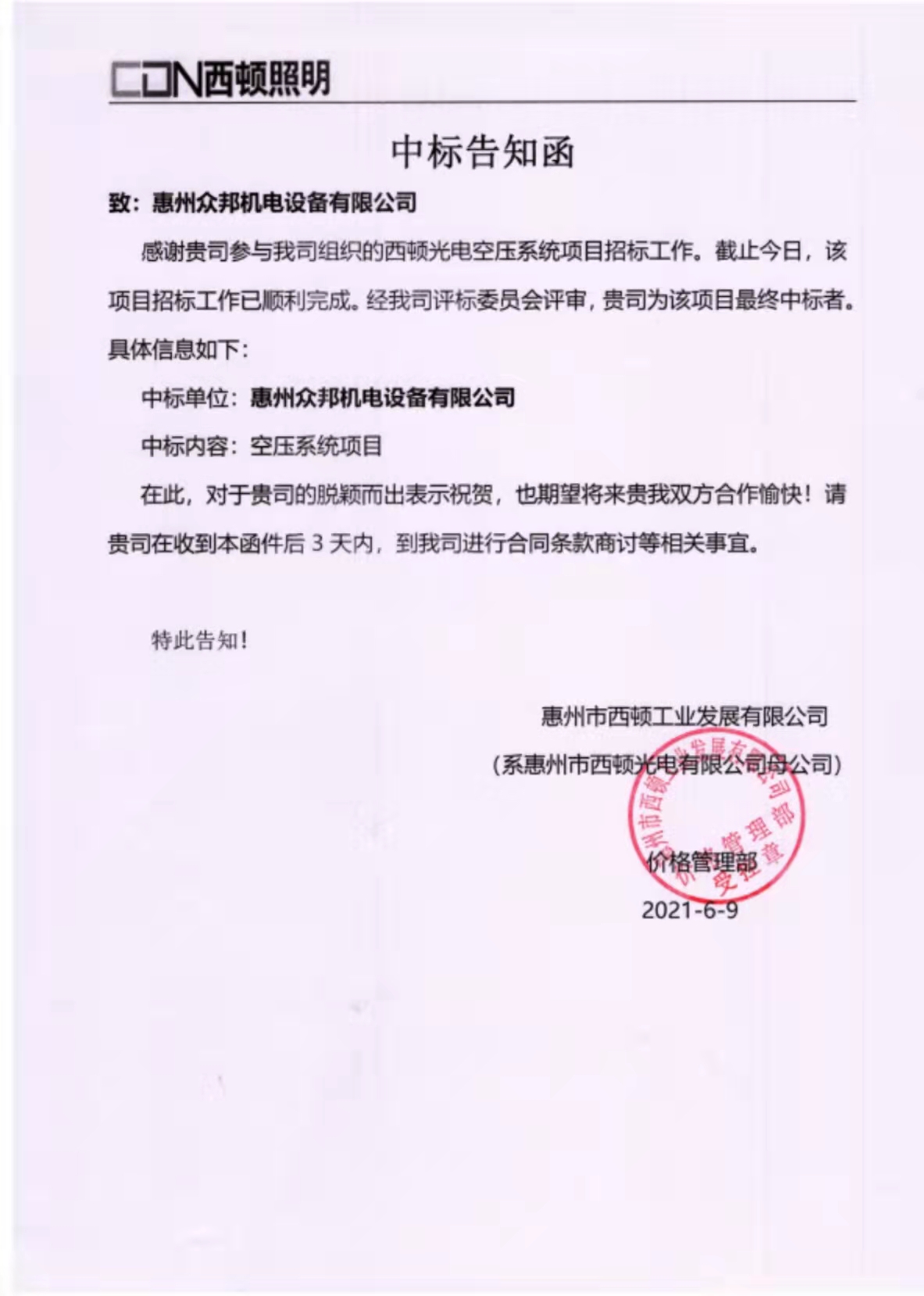 惠州市西頓光電有限公司空壓機(jī)項(xiàng)目由惠州眾邦機(jī)電設(shè)備有限公司承接,目前已全部完工并已驗(yàn)收,客戶(hù)于2022年1月4日正試投產(chǎn),祝:生意興隆!